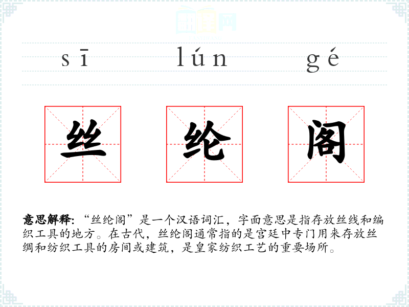 “丝纶阁”是一个汉语词汇,字面意思是指存放丝线和编织工具的地方。在古代,丝纶阁通常指的是宫廷中专门用来存放丝绸和纺织工具的房间或建筑,是皇家纺织工艺的重要场所。