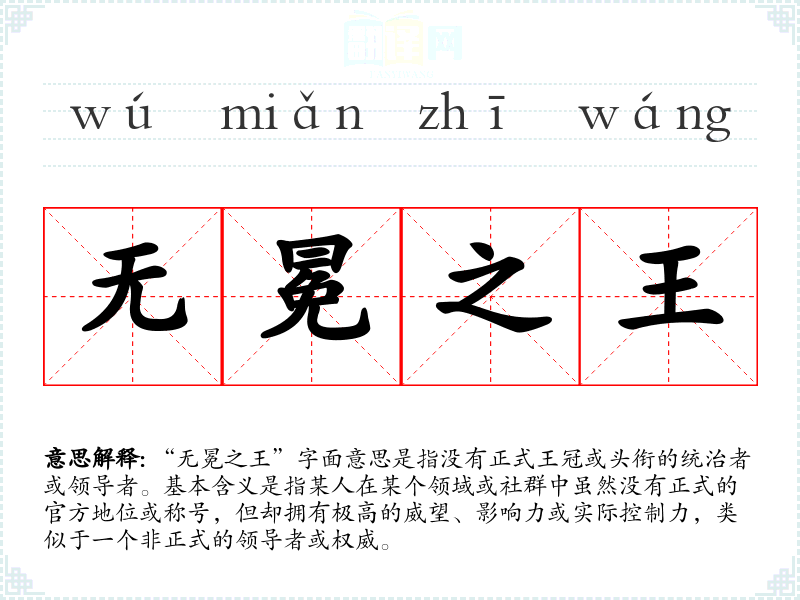 “无冕之王”字面意思是指没有正式王冠或头衔的统治者或领导者。基本含义是指某人在某个领域或社群中虽然没有正式的官方地位或称号,但却拥有极高的威望、影响力或实际控制力,类似于一个非正式的领导者或权威。