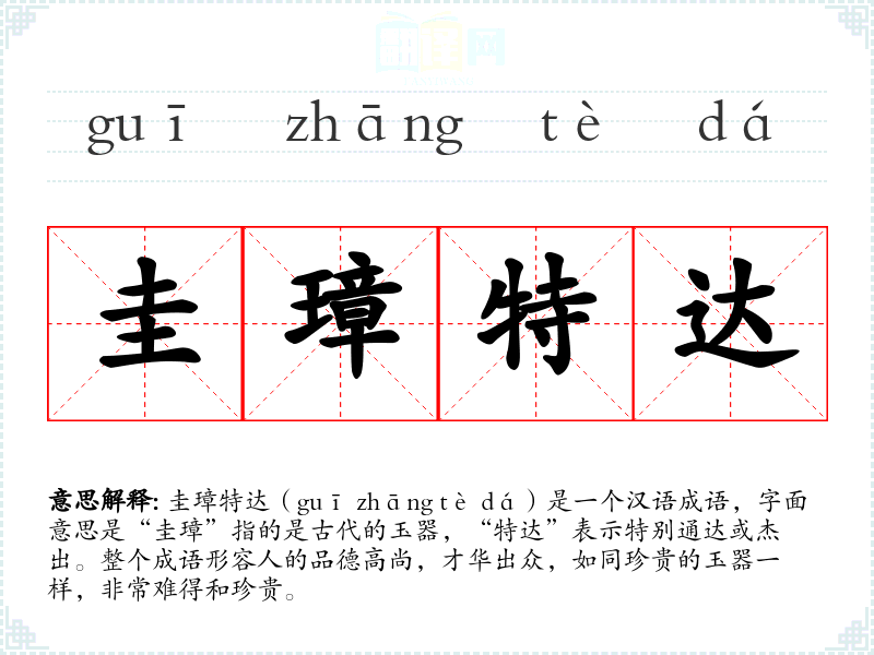 圭璋特达(guī zhāng tè dá)是一个汉语成语,字面意思是“圭璋”指的是古代的玉器,“特达”表示特别通达或杰出。整个成语形容人的品德高尚,才华出众,如同珍贵的玉器一样,非常难得和珍贵。