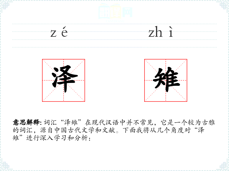 “泽雉”作为一个古雅的词汇,虽然在现代汉语中使用不多,但它承载了丰富的文化内涵和历史情感。了解和学*这样的词汇,有助于更深入地理解**古代文学和传统文化,同时也能够丰富个人的语言表达和创作能力。