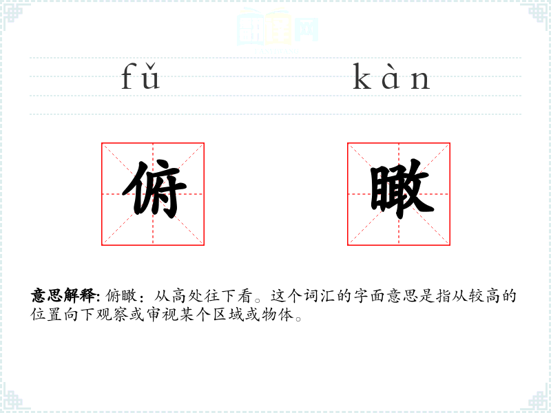 俯瞰:从高处往下看。这个词汇的字面意思是指从较高的位置向下观察或审视某个区域或物体。