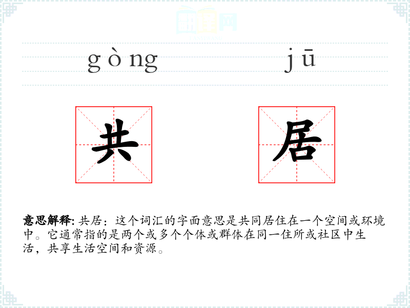 共居:这个词汇的字面意思是共同居住在一个空间或环境中。它通常指的是两个或多个个体或群体在同一住所或社区中生活,共享生活空间和资源。
