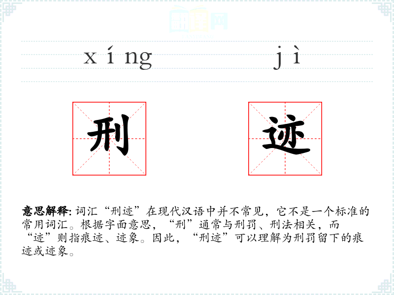 - 反义词:无(由于“刑迹”不是一个常用词汇,反义词不明显)