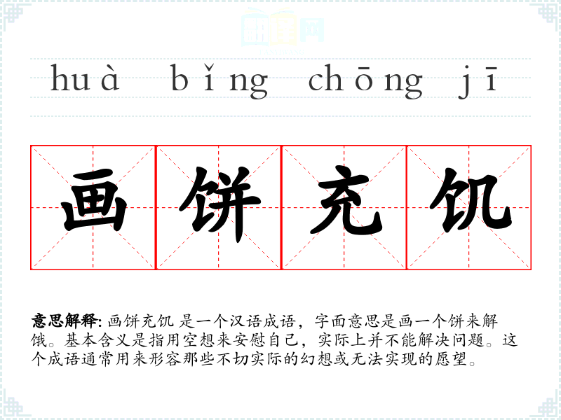 画饼充饥 是一个汉语成语,字面意思是画一个饼来解饿。基本含义是指用空想来安慰自己,实际上并不能解决问题。这个成语通常用来形容那些不切实际的幻想或无法实现的愿望。