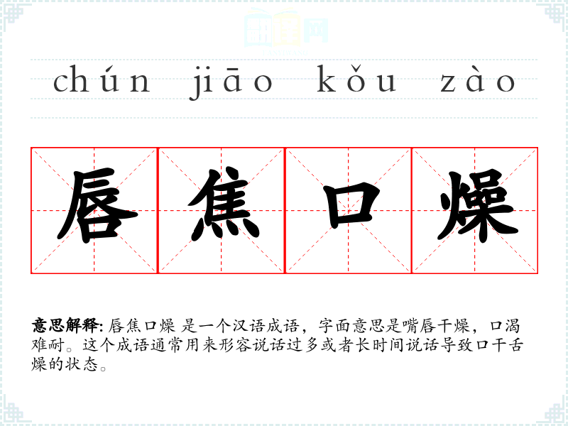 唇焦口燥 是一个汉语成语,字面意思是嘴唇干燥,口渴难耐。这个成语通常用来形容说话过多或者长时间说话导致口干舌燥的状态。