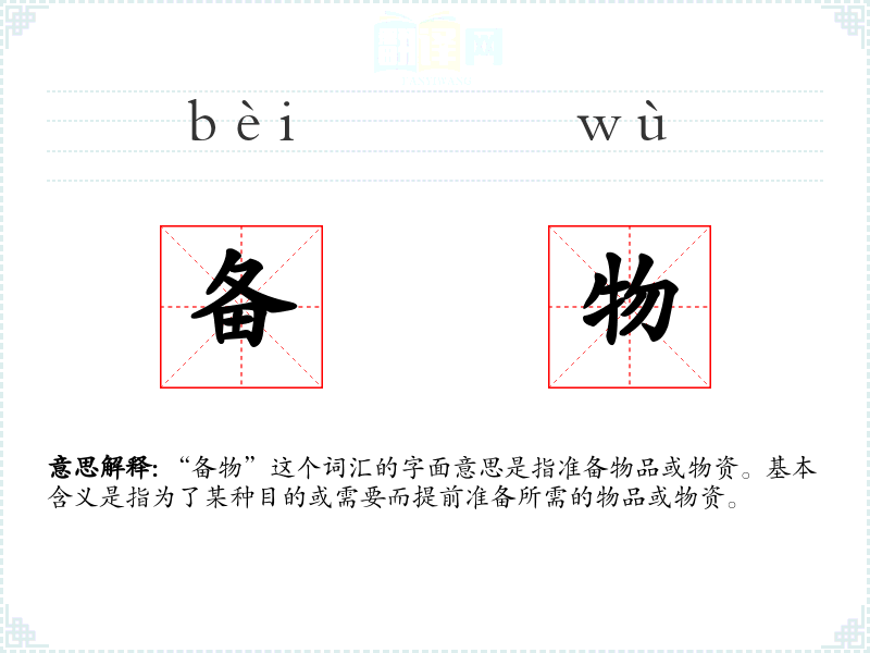 - 口语:在日常口语中,人们可能会说“备物”来指示某人准备一些日常用品或特定场合所需的物品。