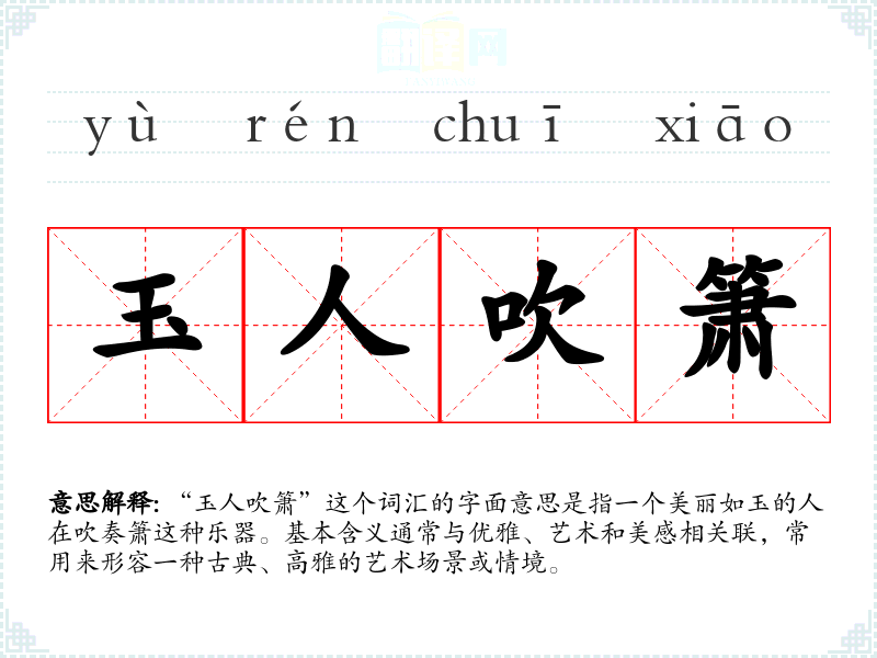 “玉人吹箫”这个词汇的字面意思是指一个美丽如玉的人在吹奏箫这种乐器。基本含义通常与优雅、艺术和美感相关联,常用来形容一种古典、高雅的艺术场景或情境。