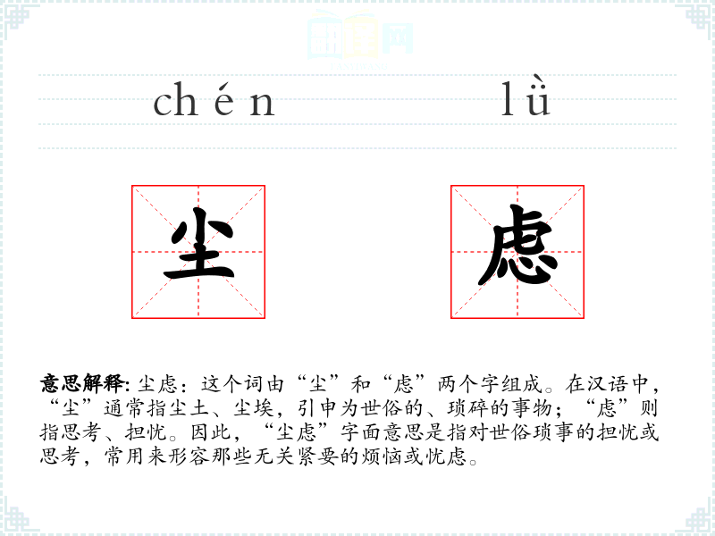 尘虑:这个词由“尘”和“虑”两个字组成。在汉语中,“尘”通常指尘土、尘埃,引申为世俗的、琐碎的事物;“虑”则指思考、担忧。因此,“尘虑”字面意思是指对世俗琐事的担忧或思考,常用来形容那些无关紧要的烦恼或忧虑。