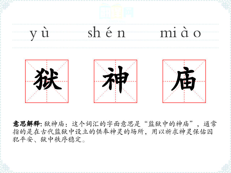 狱神庙:这个词汇的字面意思是“监狱中的神庙”,通常指的是在古代监狱中设立的供奉神灵的场所,用以祈求神灵保佑囚犯平安、狱中秩序稳定。
