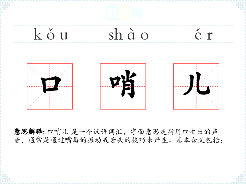 口哨儿 是一个汉语词汇,字面意思是指用口吹出的声音,通常是通过嘴唇的振动或舌头的技巧来产生。基本含义包括: