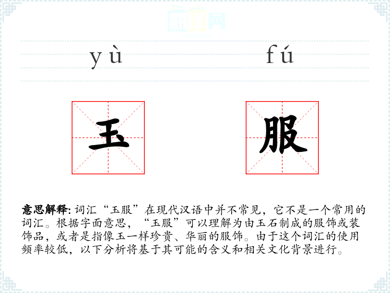 “玉服”字面意思是由玉石制成的服饰或装饰品,或者是指非常珍贵、华丽的服饰,类似于“玉衣”或“玉饰”。