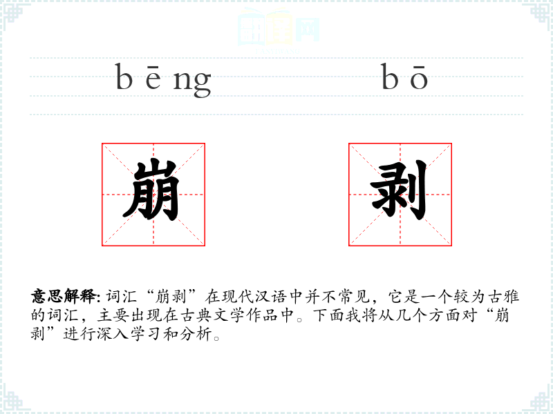 词汇“崩剥”在现代汉语中并不常见,它是一个较为古雅的词汇,主要出现在古典文学作品中。下面我将从几个方面对“崩剥”进行深入学习和分析。