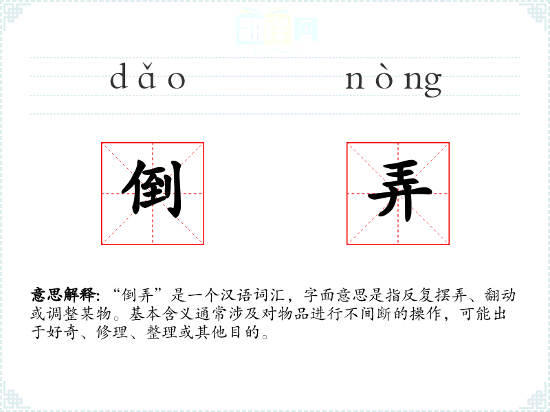 “倒弄”一词的词源较为普通,主要由“倒”和“弄”两个字组成。在古代汉语中,“倒”有翻转、颠倒之意,“弄”则指操作、玩耍。随着时间的推移,这两个字结合形成了“倒弄”这一词汇,用于描述对物品的反复操作。