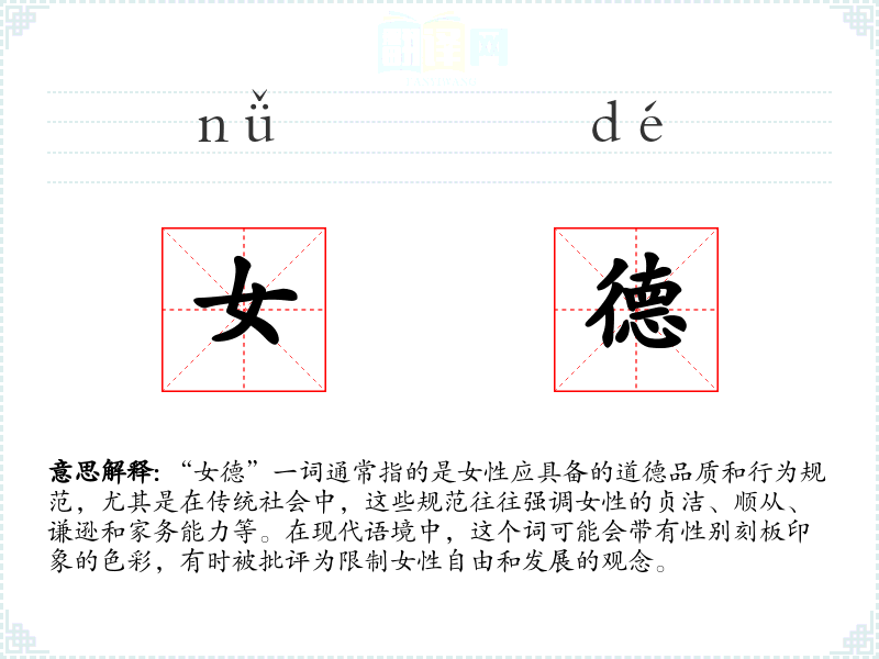 "女德"的意思解释、女德是什么意思由翻译网汉语词典查词提供。
