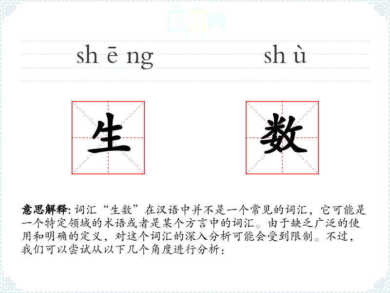 由于“生数”不是一个常见的词汇,我们对它的理解可能会受到限制。在语言学习和表达中,这个词汇可能不是一个重要的词汇,除非是在特定的领域或语境下。
