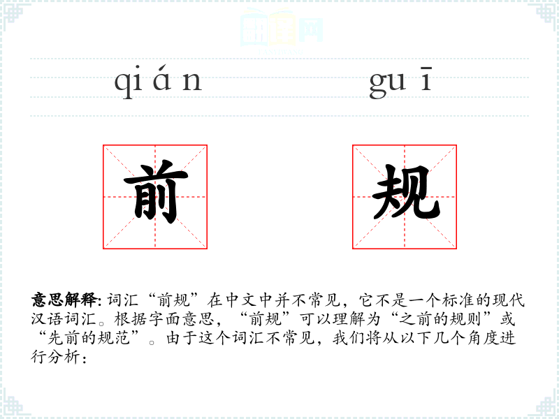 词汇“前规”在中文中并不常见,它不是一个标准的现代汉语词汇。根据字面意思,“前规”可以理解为“之前的规则”或“先前的规范”。由于这个词汇不常见,我们将从以下几个角度进行分析: