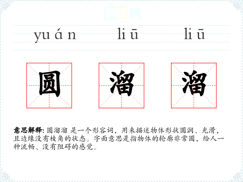 圆溜溜 是一个形容词,用来描述物体形状圆润、光滑,且边缘没有棱角的状态。字面意思是指物体的轮廓非常圆,给人一种流畅、没有阻碍的感觉。