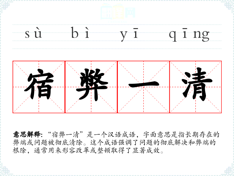 “宿弊一清”是一个汉语成语,字面意思是指长期存在的弊端或问题被彻底清除。这个成语强调了问题的彻底解决和弊端的根除,通常用来形容改革或整顿取得了显著成效。