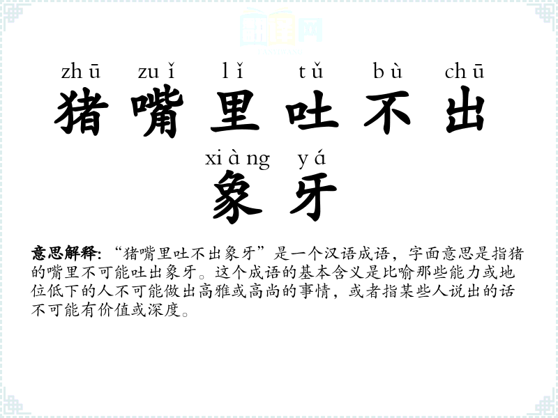 “猪嘴里吐不出象牙”是一个汉语成语,字面意思是指猪的嘴里不可能吐出象牙。这个成语的基本含义是比喻那些能力或地位低下的人不可能做出高雅或高尚的事情,或者指某些人说出的话不可能有价值或深度。