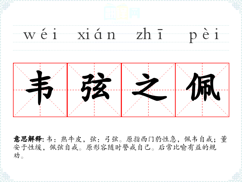 韦:熟牛皮,弦:弓弦。原指西门豹性急,佩韦自戒;董安于性缓,佩弦自戒。原形容随时警戒自己。后常比喻有益的规劝。