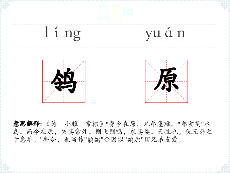 《诗.小雅.常棣》"脊令在原,兄弟急难。"郑玄笺"水鸟,而今在原,失其常处,则飞则鸣,求其类,天性也。犹兄弟之于急难。"脊令,也写作"鹡鸰"◇因以"鸰原"谓兄弟友爱。