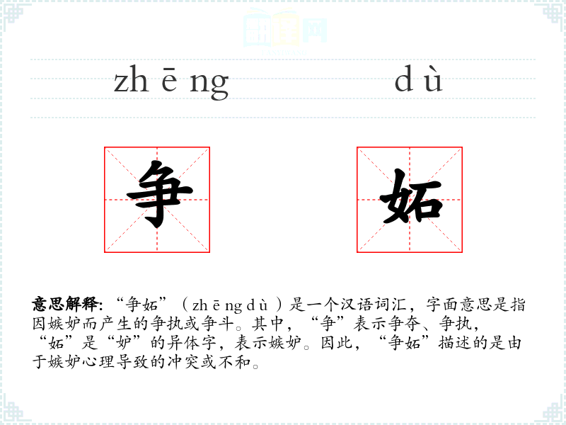 “争妬”(zhēng dù)是一个汉语词汇,字面意思是指因嫉妒而产生的争执或争斗。其中,“争”表示争夺、争执,“妬”是“妒”的异体字,表示嫉妒。因此,“争妬”描述的是由于嫉妒心理导致的冲突或不和。