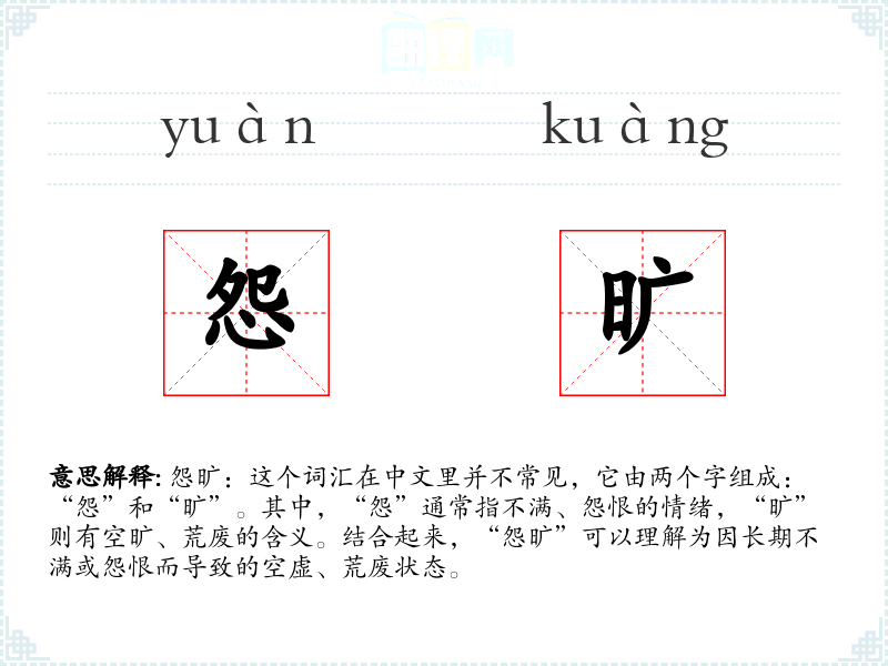 怨旷:这个词汇在中文里并不常见,它由两个字组成:“怨”和“旷”。其中,“怨”通常指不满、怨恨的情绪,“旷”则有空旷、荒废的含义。结合起来,“怨旷”可以理解为因长期不满或怨恨而导致的空虚、荒废状态。