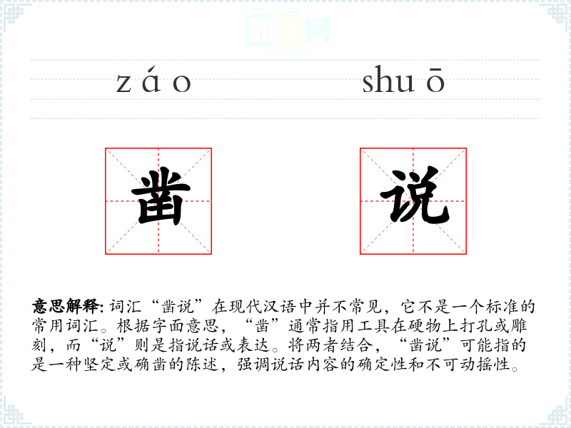 词汇“凿说”在现代汉语中并不常见,它不是一个标准的常用词汇。根据字面意思,“凿”通常指用工具在硬物上打孔或雕刻,而“说”则是指说话或表达。将两者结合,“凿说”可能指的是一种坚定或确凿的陈述,强调说话内容的确定性和不可动摇性。