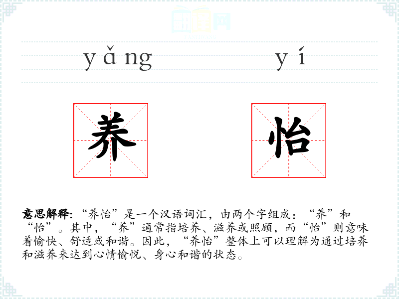 “养怡”是一个汉语词汇,由两个字组成:“养”和“怡”。其中,“养”通常指培养、滋养或照顾,而“怡”则意味着愉快、舒适或和谐。因此,“养怡”整体上可以理解为通过培养和滋养来达到心情愉悦、身心和谐的状态。