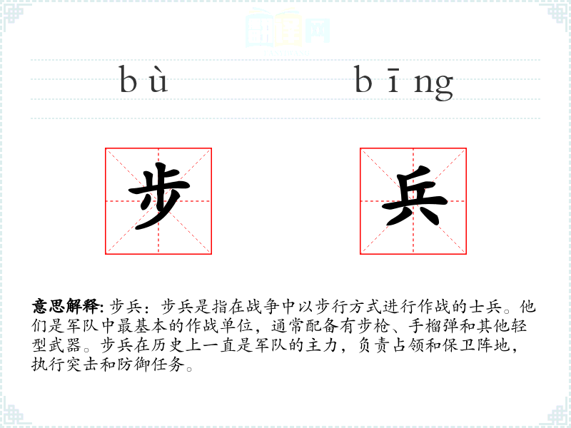 - 反义词:骑兵(以马匹为交通工具的士兵)、炮兵(操作火炮的士兵)