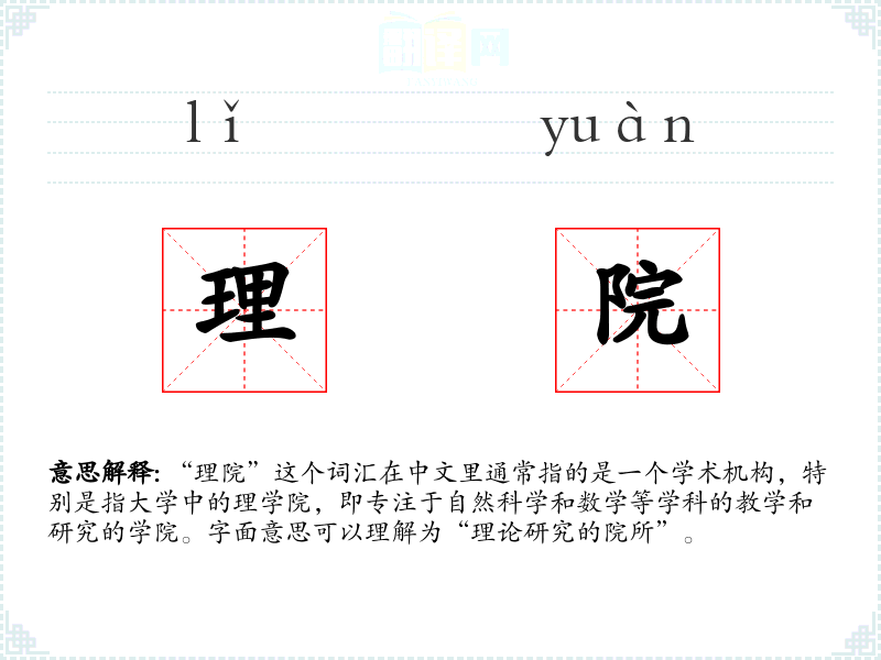 “理院”这个词汇在中文里通常指的是一个学术机构,特别是指大学中的理学院,即专注于自然科学和数学等学科的教学和研究的学院。字面意思可以理解为“理论研究的院所”。