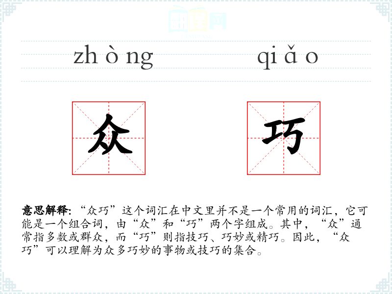 由于“众巧”不是一个常用词汇,它的词源和演变可能不太明确。它可能是由“众”和“巧”两个常用词汇组合而成的新词,用以表达特定的意义。