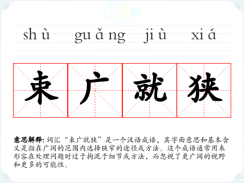 词汇“束广就狭”是一个汉语成语,其字面意思和基本含义是指在广阔的范围内选择狭窄的途径或方法。这个成语通常用来形容在处理问题时过于拘泥于细节或方法,而忽视了更广阔的视野和更多的可能性。