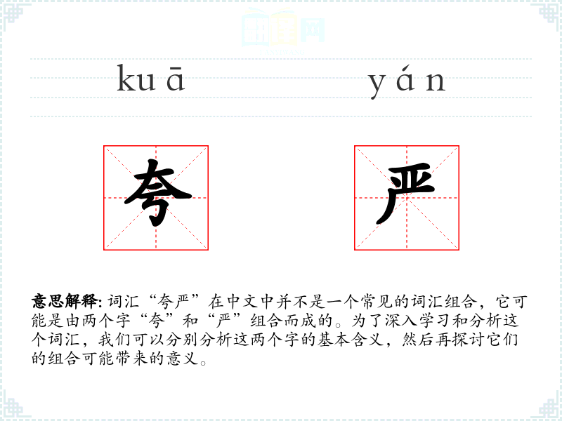 词汇“夸严”在中文中并不是一个常见的词汇组合,它可能是由两个字“夸”和“严”组合而成的。为了深入学习和分析这个词汇,我们可以分别分析这两个字的基本含义,然后再探讨它们的组合可能带来的意义。