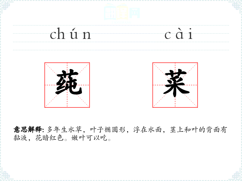 多年生水草,叶子椭圆形,浮在水面,茎上和叶的背面有黏液,花暗红色。嫩叶可以吃。