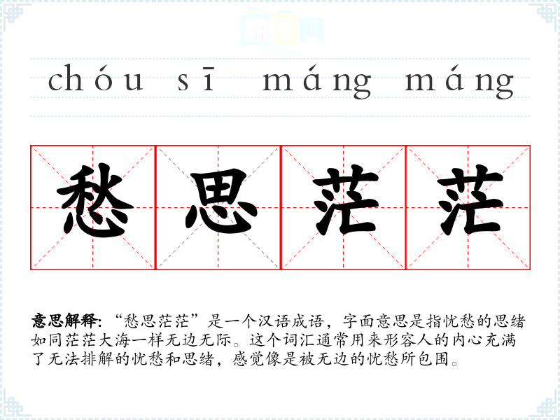 “愁思茫茫”是一个汉语成语,字面意思是指忧愁的思绪如同茫茫大海一样无边无际。这个词汇通常用来形容人的内心充满了无法排解的忧愁和思绪,感觉像是被无边的忧愁所包围。