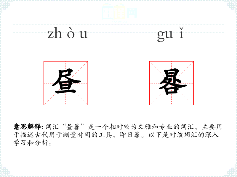 词汇“昼晷”是一个相对较为文雅和专业的词汇,主要用于描述古代用于测量时间的工具,即日晷。以下是对该词汇的深入学习和分析: