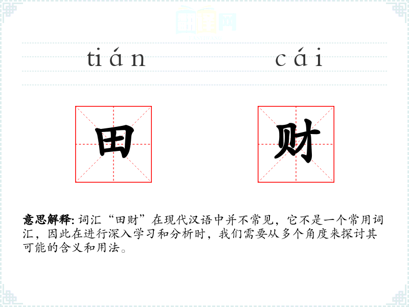 - 反义词:无(由于“田财”不是一个常用词汇,反义词可能不明显)