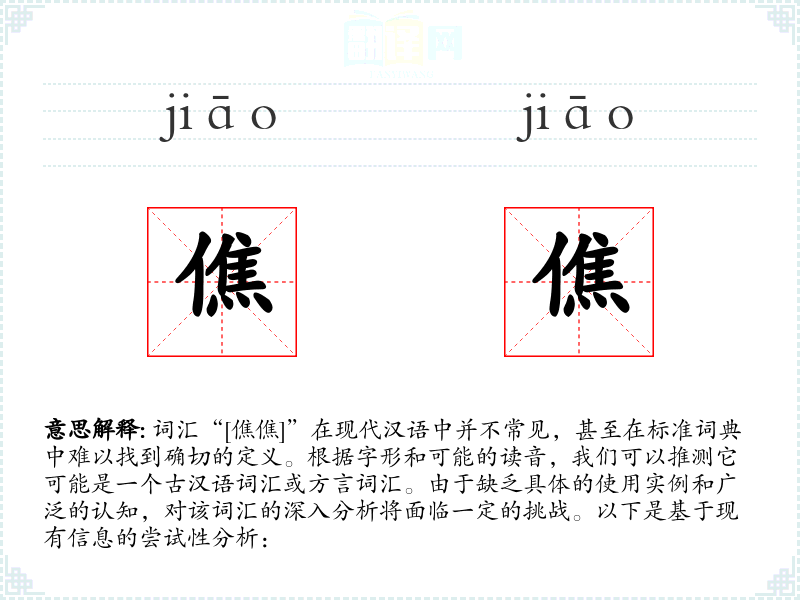 词汇“[僬僬]”在现代汉语中并不常见,甚至在标准词典中难以找到确切的定义。根据字形和可能的读音,我们可以推测它可能是一个古汉语词汇或方言词汇。由于缺乏具体的使用实例和广泛的认知,对该词汇的深入分析将面临一定的挑战。以下是基于现有信息的尝试性分析: