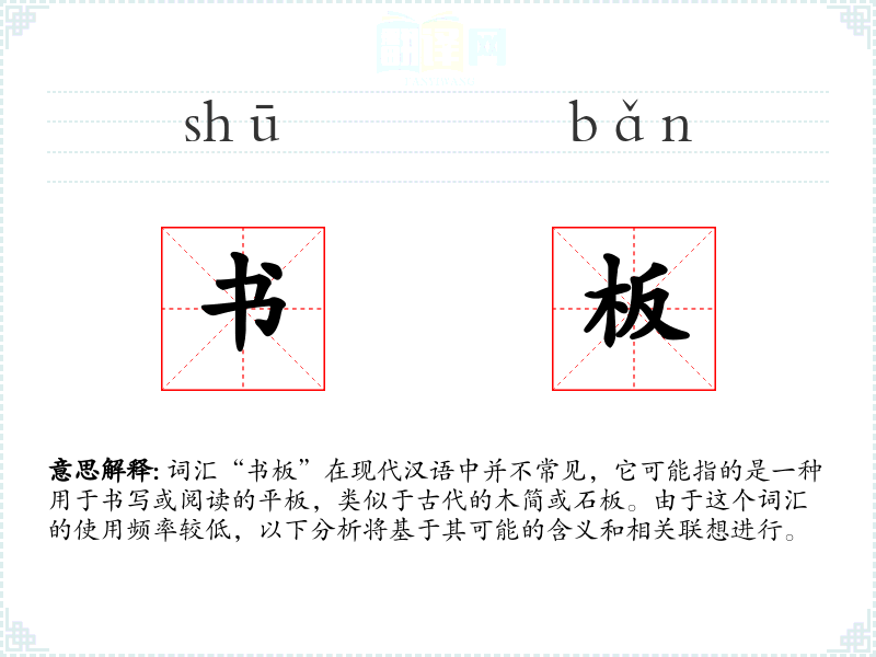 词汇“书板”在现代汉语中并不常见,它可能指的是一种用于书写或阅读的平板,类似于古代的木简或石板。由于这个词汇的使用频率较低,以下分析将基于其可能的含义和相关联想进行。