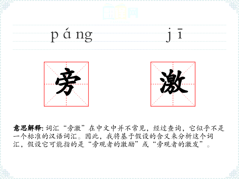 词汇“旁激”在中文中并不常见,经过查询,它似乎不是一个标准的汉语词汇。因此,我将基于假设的含义来分析这个词汇,假设它可能指的是“旁观者的激励”或“旁观者的激发”。