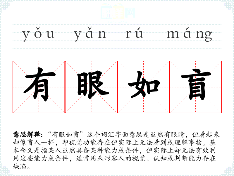 “有眼如盲”这个词汇字面意思是虽然有眼睛,但看起来却像盲人一样,即视觉功能存在但实际上无法看到或理解事物。基本含义是指某人虽然具备某种能力或条件,但实际上却无法有效利用这些能力或条件,通常用来形容人的视觉、认知或判断能力存在缺陷。