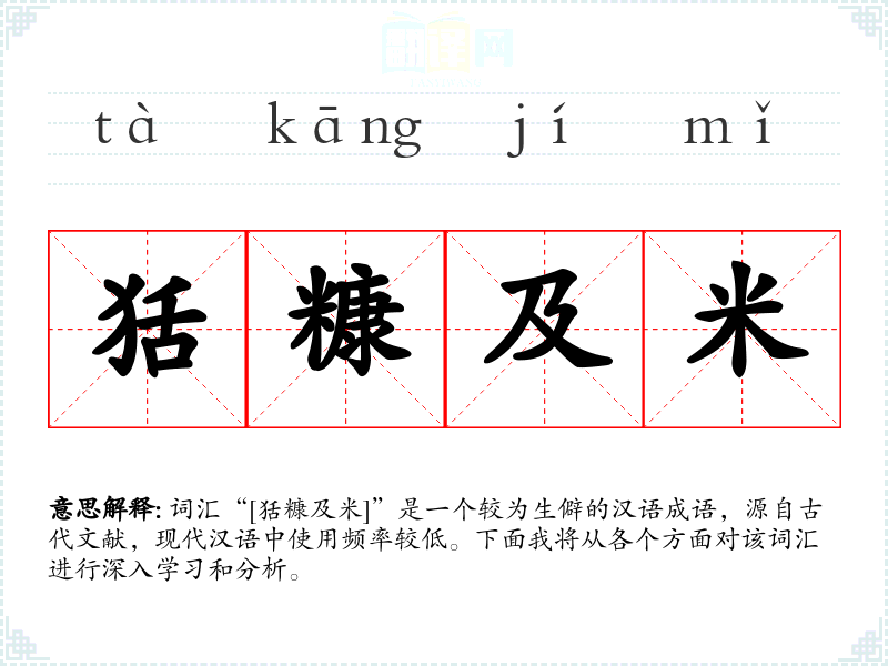 词汇“[狧糠及米]”是一个较为生僻的汉语成语,源自古代文献,现代汉语中使用频率较低。下面我将从各个方面对该词汇进行深入学*和分析。
