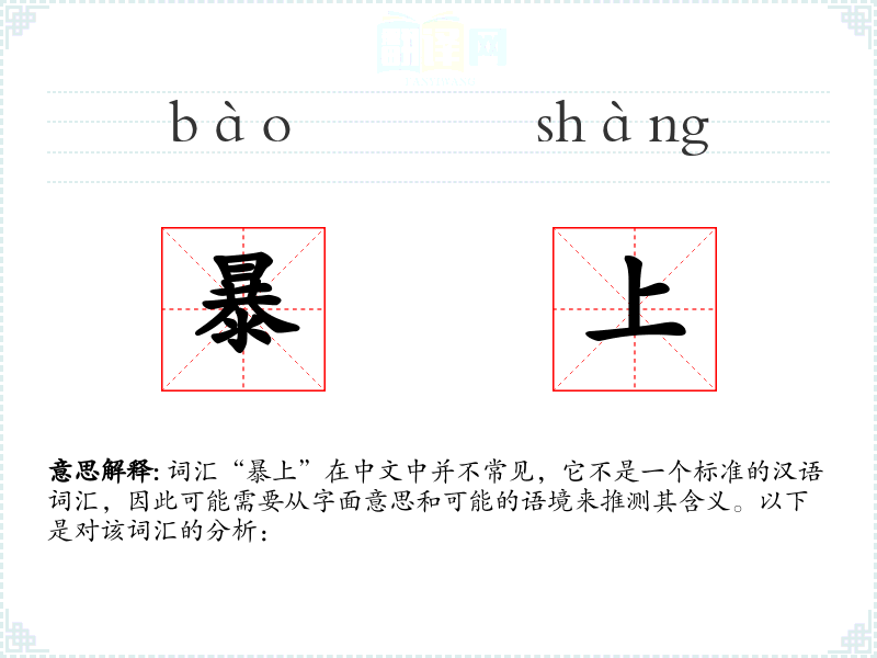 词汇“暴上”在中文中并不常见,它不是一个标准的汉语词汇,因此可能需要从字面意思和可能的语境来推测其含义。以下是对该词汇的分析: