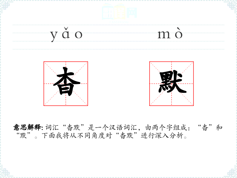 - 词源:“杳”字源自古代汉语,意为深远、不可见;“默”字也源自古代汉语,意为无声、不说话。