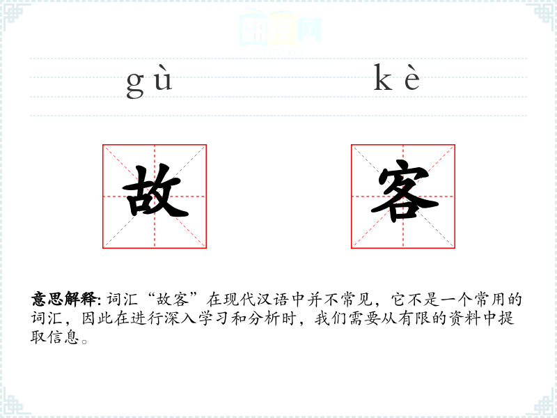 词汇“故客”在现代汉语中并不常见,它不是一个常用的词汇,因此在进行深入学*和分析时,我们需要从有限的资料中提取信息。