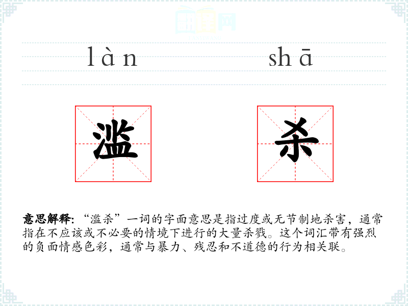 “滥杀”一词的字面意思是指过度或无节制地杀害,通常指在不应该或不必要的情境下进行的大量杀戮。这个词汇带有强烈的负面情感色彩,通常与暴力、残忍和不道德的行为相关联。