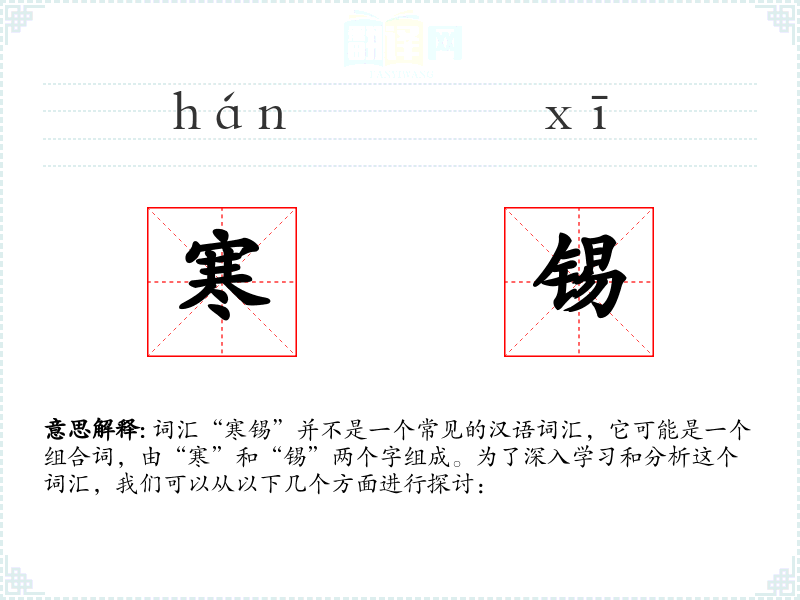词汇“寒锡”并不是一个常见的汉语词汇,它可能是一个组合词,由“寒”和“锡”两个字组成。为了深入学习和分析这个词汇,我们可以从以下几个方面进行探讨: