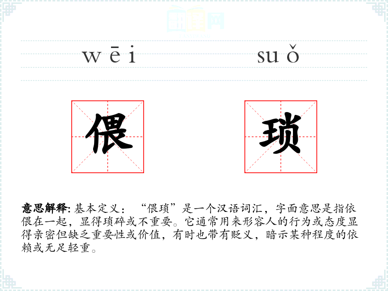 基本定义: “偎琐”是一个汉语词汇,字面意思是指依偎在一起,显得琐碎或不重要。它通常用来形容人的行为或态度显得亲密但缺乏重要性或价值,有时也带有贬义,暗示某种程度的依赖或无足轻重。