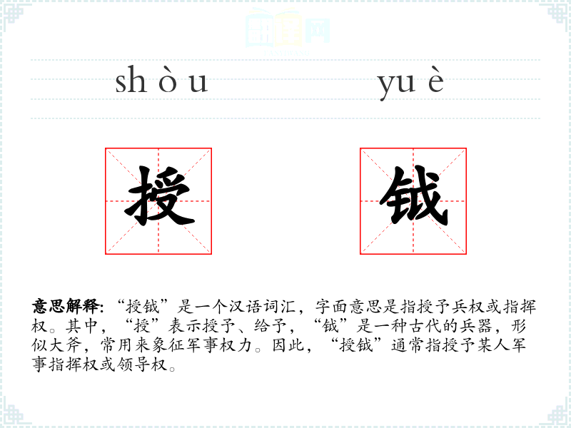“授钺”是一个汉语词汇,字面意思是指授予兵权或指挥权。其中,“授”表示授予、给予,“钺”是一种古代的兵器,形似大斧,常用来象征军事权力。因此,“授钺”通常指授予某人军事指挥权或领导权。